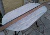 Découpe de bandes UD, j’ai choisi cette option car la largeur du renfort va en diminuant de part et d’autre du longeron et la méthode qui consistait à faire un accordéon, de part ce fait, ne me convenait pas.